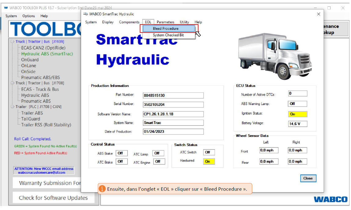 Connect to J1939 via the communication port inside the cabin and open WABCO Toolbox. Follow the instructions below.